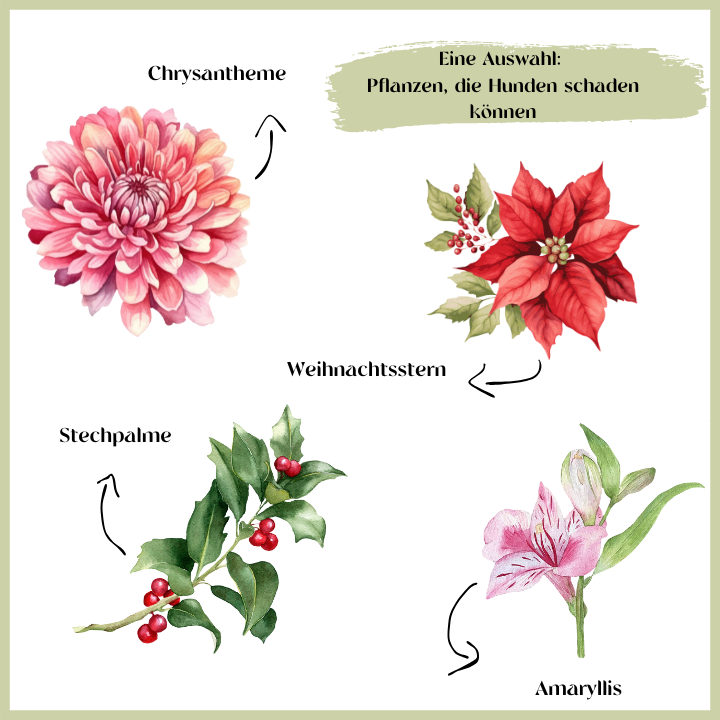 Im Herbst und Winter zieht oft auch die Natur ins Haus – mit hübschen Dekorationen und saisonalen Pflanzen. Doch einige dieser Pflanzen wie Chrysanthemen, Stechpalmen, Amaryllis und Weihnachtssterne können für Hunde giftig sein. Besonders der Weihnachtsstern, den viele in der Adventszeit geschenkt bekommen oder selbst aufstellen, enthält Stoffe, die bei Hunden zu Vergiftungserscheinungen wie Erbrechen, Durchfall und Schleimhautreizungen führen können. Selbst wenn die Pflanzen nur dekorativ platziert sind, können neugierige Vierbeiner leicht daran knabbern.
