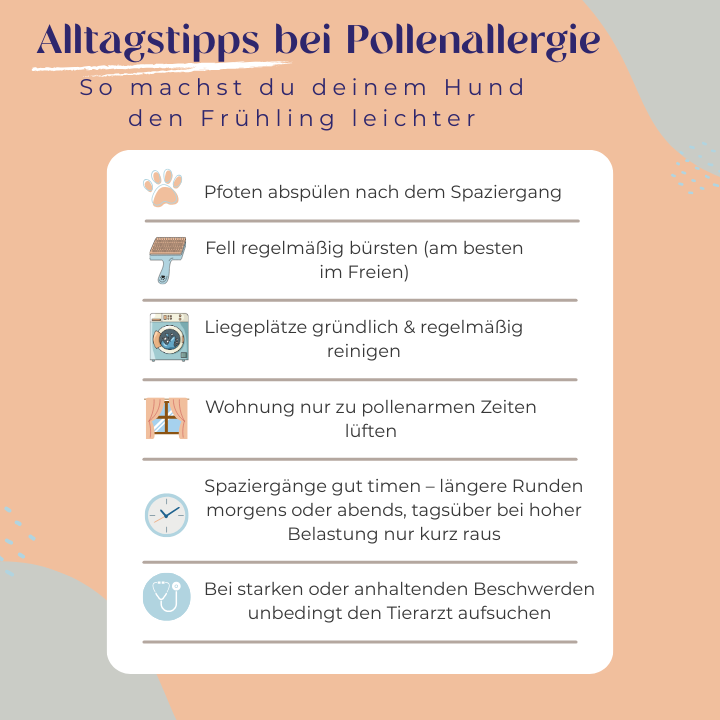 - Pfoten nach dem Spaziergang abspülen, um Pollenreste zu entfernen
