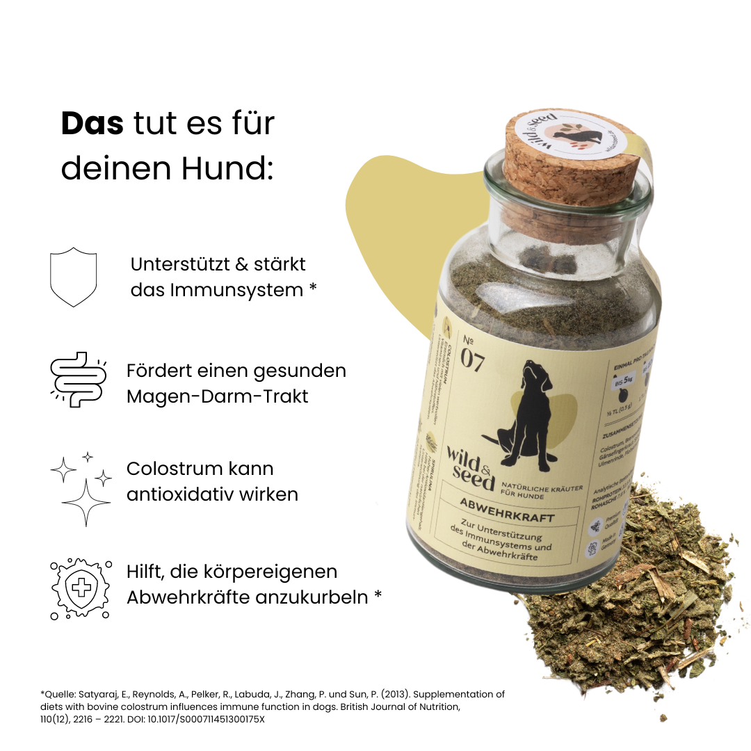 SKU: 510017 Kategorien: Nahrungsergänzung, Magen und Darm, Natürlicher Abwehr, Groß und stark werden (Welpen), Vitalität erhalten (Senior) Schlagwort NahrungsergänzungNo.07 AbwehrKraft ist unsere natürliche Kräutermischung zur Unterstützung des Immunsystems deines Hundes. Mit hochwertigen Inhaltsstoffen wie Kolostrum und Hagebuttenschalen stärkt sie die körpereigenen Abwehrkräfte – ideal für Hunde jeden Alters.