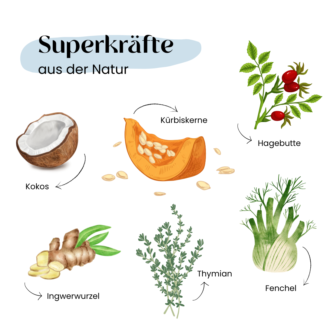 Fenchel: Unterstützt eine gute Verdauung, hilft bei Blähungen und beruhigt Magen und Darm.