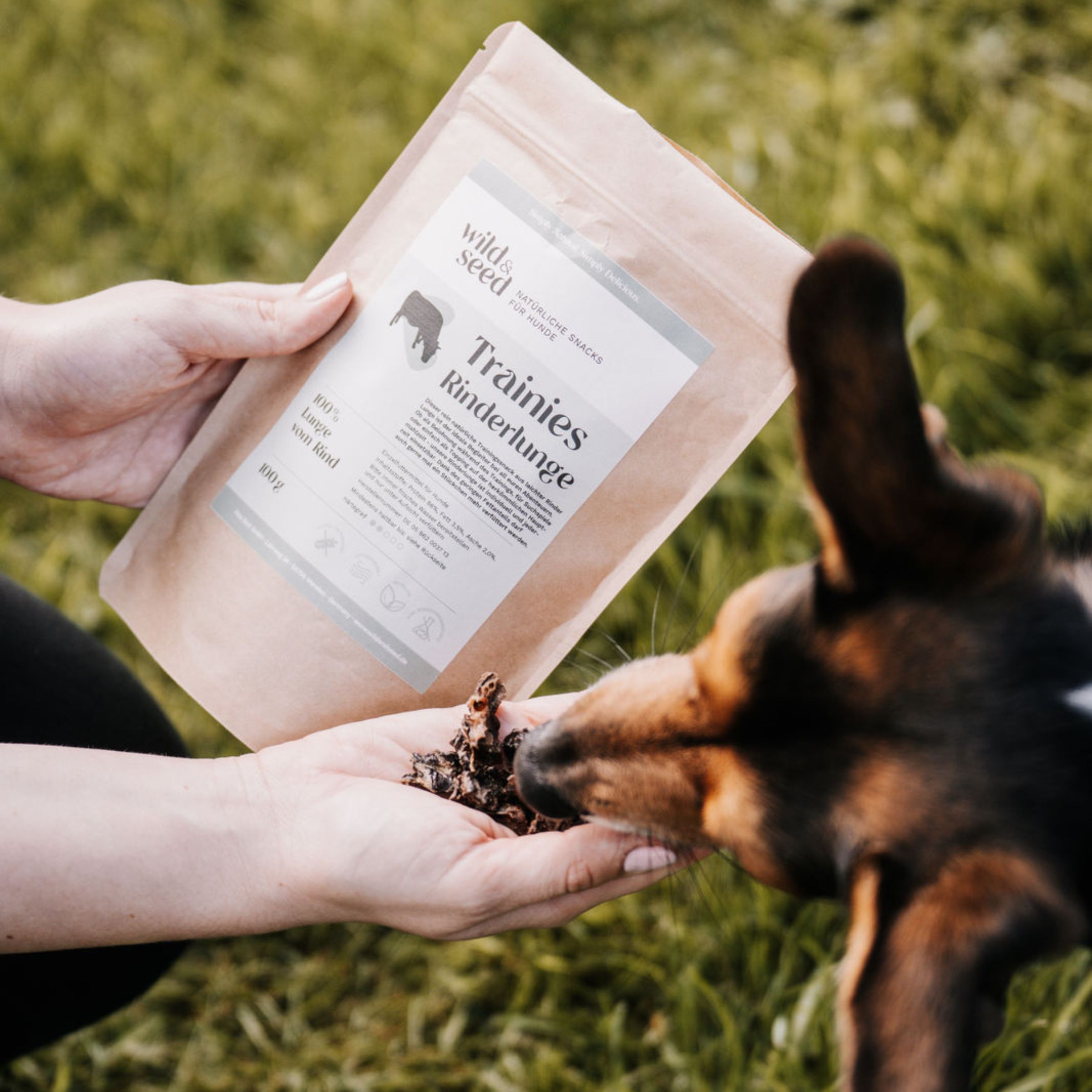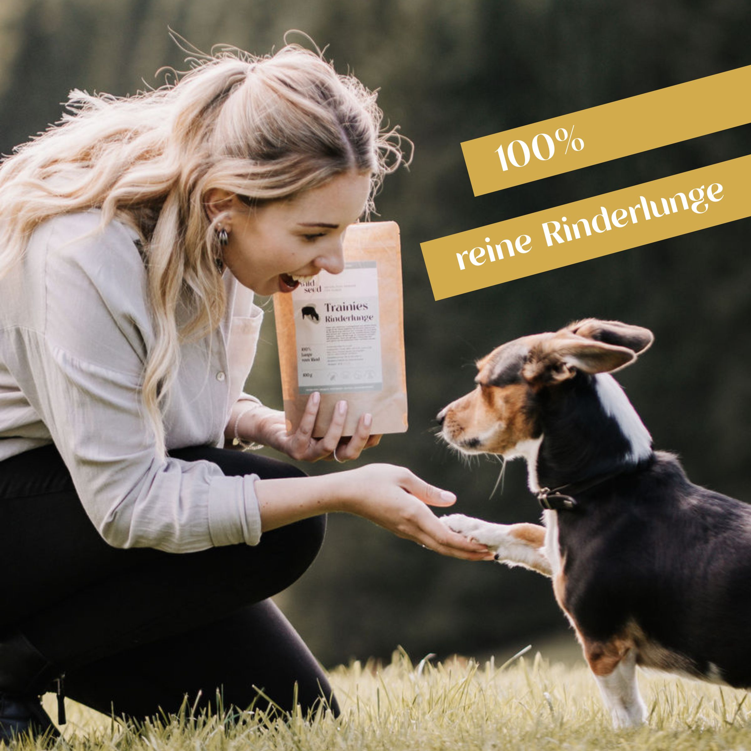 "Mit den kleinen Rinderlungen-Stücken machen wir unterwegs gerne Suchspiele: Ich lasse Fiete warten und verstecke die Snacks. Auf mein Kommando darf er suchen gehen. Damit wird jeder Spaziergang zu einem echten Highlight für unsere Fellnase!"