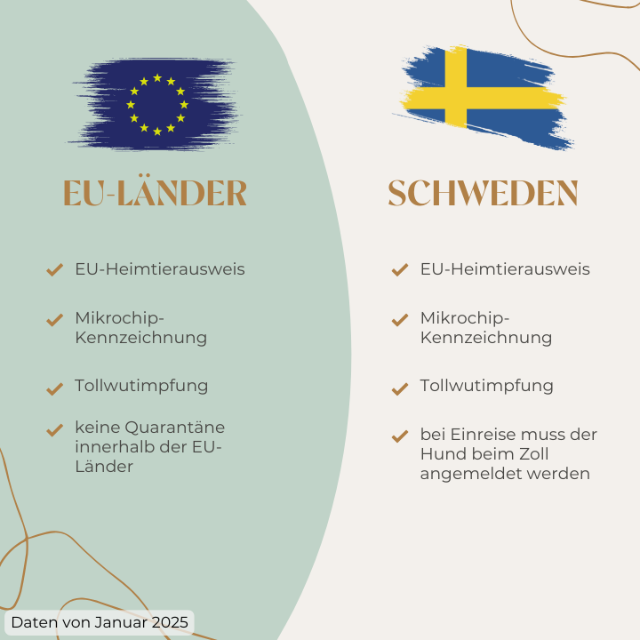 Für Schweden gelten die allgemeinen EU-Vorschriften: Dein Hund benötigt einen EU-Heimtierausweis, eine Mikrochip-Kennzeichnung und eine gültige Tollwutimpfung.