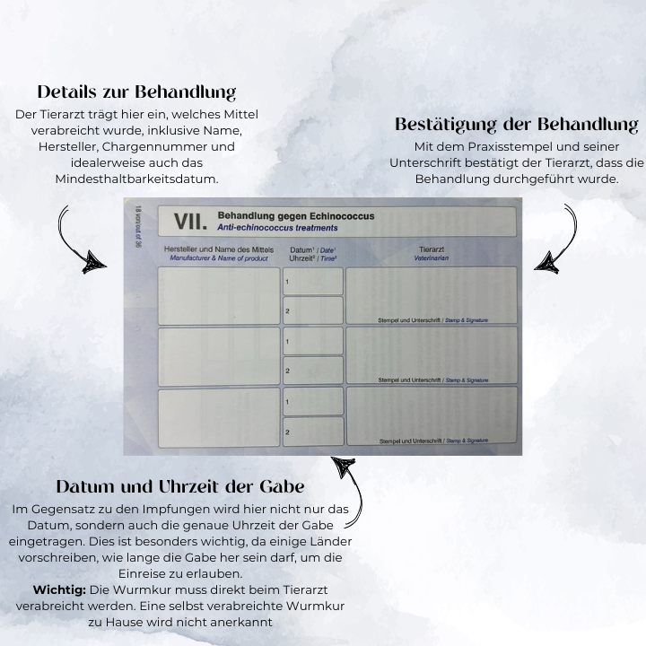 Zusätzliche Impfungen oder Behandlungen wie Entwurmungen können eingetragen werden, wenn sie für bestimmte Länder erforderlich sind.