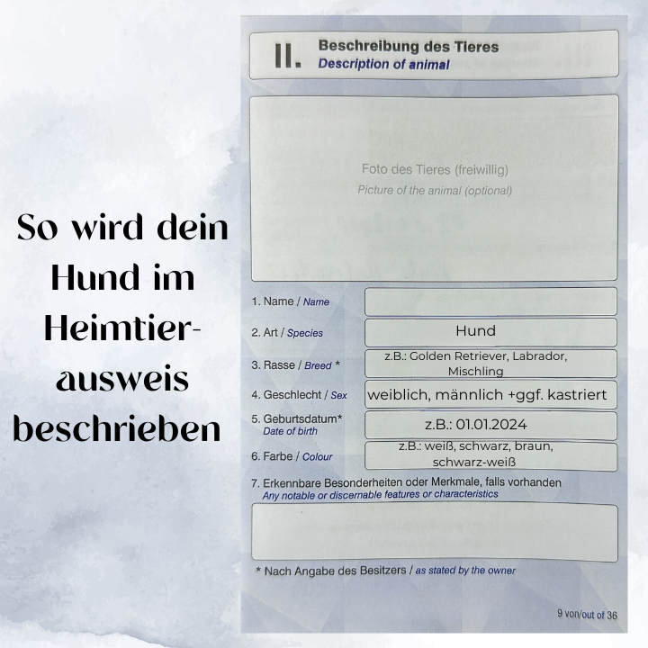 Der EU-Heimtierausweis enthält alle relevanten Informationen über deinen Hund sowie die notwendigen Einträge für eine sichere und reibungslose Reise. Dazu gehören: