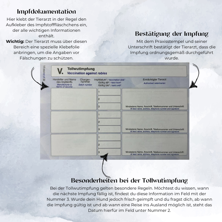 Besonders wichtig ist die Eintragung der Tollwutimpfung, da diese Voraussetzung für die Einreise in alle EU-Länder ist. Die Impfungen werden mit Datum, Impfstoffhersteller und Gültigkeitszeitraum dokumentiert.