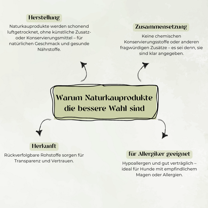 - Für Allergiker geeignet: Naturkauprodukte sind häufig hypoallergen und besonders gut verträglich, was sie zur idealen Wahl für Hunde mit empfindlichem Magen oder Allergien macht.